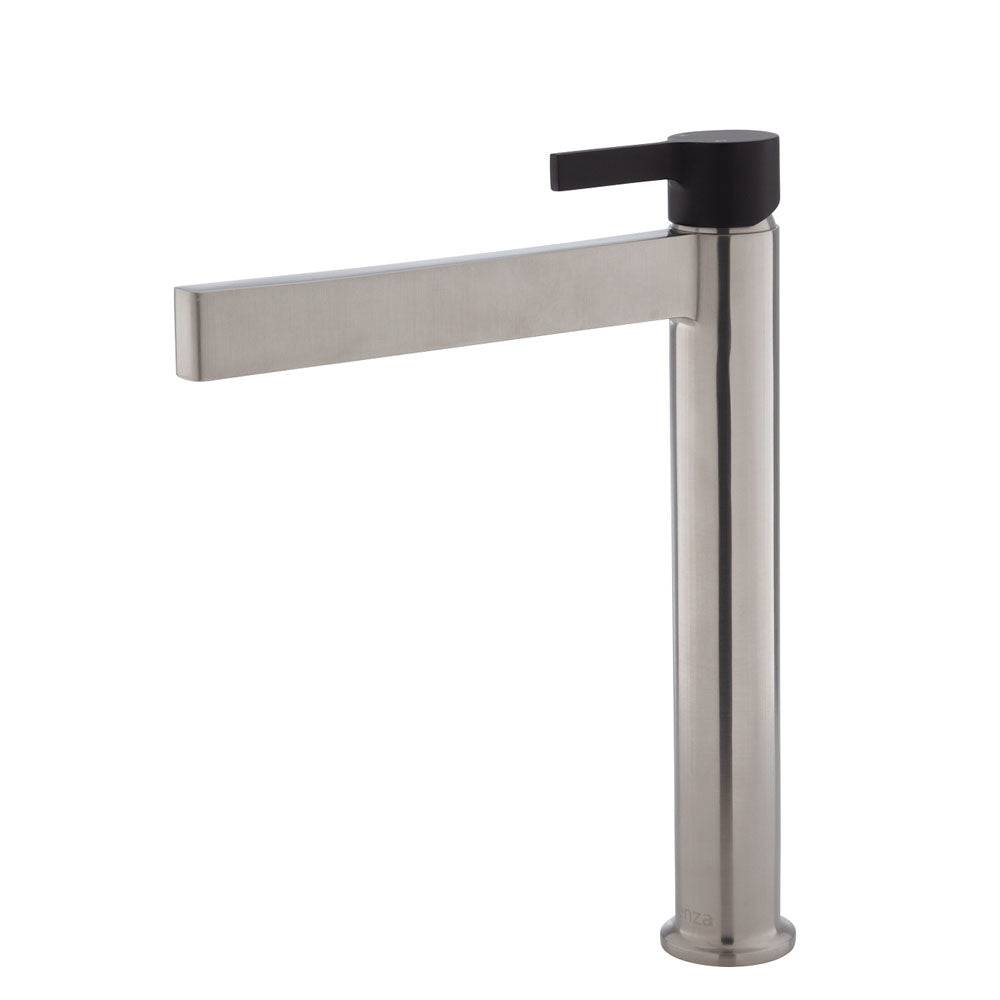 - PVD brushed nickel finish with electroplated matte black handle
